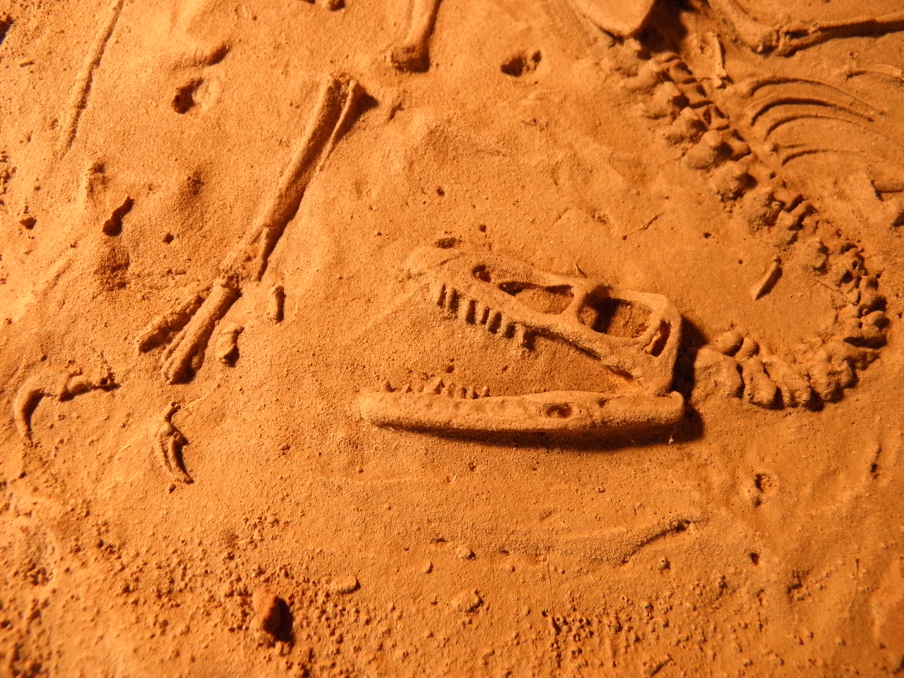 There is an interesting story behind the 8 inch by 8 inch plaque type mount. A long time ago I actually made a full raptor skeleton with a tiny 1" long skull, about 1/10 scale. It was very tiny and delicate. At the time I was not as experienced at casting so to cast such tiny bones in a kit proved to be too much. After a few home moves it got damaged and I decided to just stick most of the bones in plaque and make an idealized "in situ" type dig scene.